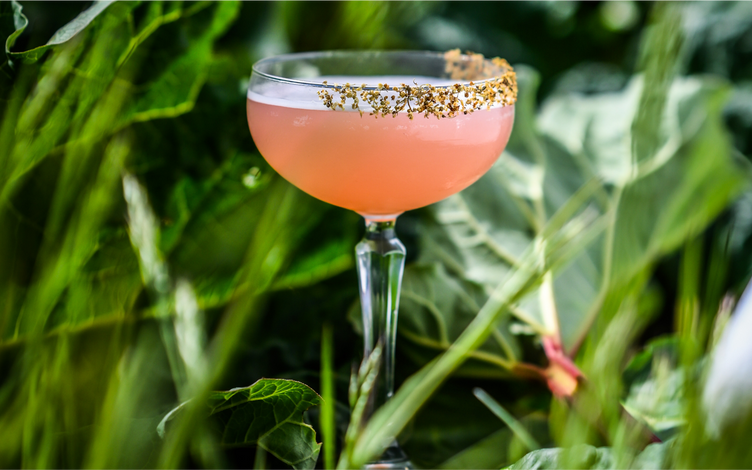 En læskende gin-cocktail med hyben og hyldeblomst.
