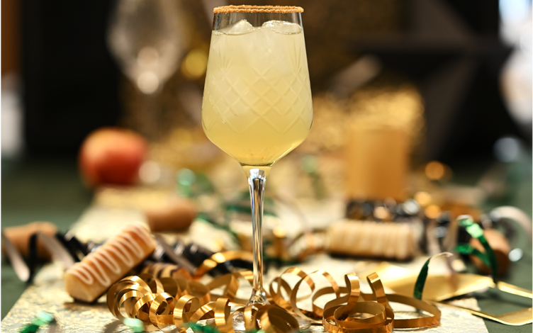 En boblende nytårscocktail med æble og marcipan.
